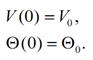 Уравнения (3.6) вместе с (3.8) составляют систему четырех нелинейных уравнений первого порядка относительно функций x, y, V, θ. Это связанная система нелинейных дифференциальных уравнений, явное решение которых невозможно и возникает необходимость в приближенном численном решении на ЭВМ. Решение системы (3.6), (3.8) должно удовлетворять четырем необходимым начальным условиям. Считаем, что снаряд выпускается в момент времени t = 0, так что (x0) = 0, (y0) = 0. Другие два начальных условия даются соотношениями