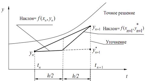 Рис. 3.4. Геометрическая интерпретация модифицированного метода В модифицированном методе Эйлера сначала вычисляется значение функции в следующей точке по простому методу Эйлера: