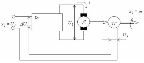 Рис. 4.22. Регулируемый электропривод В данной системе входное воздействие – напряжение U1- сравнивается с выходным напряжением тахогенератора (ТГ) U3. Разница этих напряжений ΔU =U1 -U3 усиливается усилителем Y, и подается на якорь двигателя постоянного тока Д. Частота вращения вала электродвигателя с помощью тахогенератора ТГ, преобразуется в пропорциональный сигнал обратной связи U3. Сеть связей рассматриваемой системы имеет следующий вид (рис. 4.23).