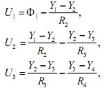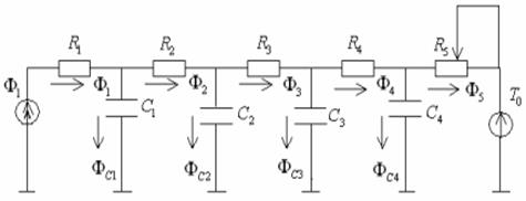 Тепловой поток от нагревателя Ф1 проходит последовательно через цепь выделенных элементов. Поперечное сечение элементов заданно. Количество элементов в данном случае - 4. Проходя через теплопроводящую цепь элементов, тепловой поток преодолевает тепловое сопротивление этих элементов. Кроме того, часть теплового потока идет на потери тепла, связанные с теплоемкостью металла, из которого изготовлен штамп. Поэтому тепловой поток, проходящий через наружную поверхность Ф2< Ф1. Эквивалентная электрическая схема замещения представляет собой линию задержки, состоящую из последовательно включенных RC-цепочек (рис. 6.43). Активное сопротивление цепочки имитирует тепловое сопротивление, а электрическая емкость – теплоемкость элемента.