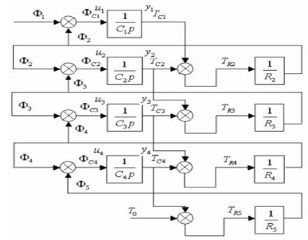 Таким образом, температура поверхности штампа не остается постоянной. Она периодически изменяется от минимального значения до максимального значения. Чтобы построить структурную схему математической модели, надо определить тепловой поток Ф1, проходящий через поперечное сечение элементов. Весь тепловой поток, излучаемый электрическим нагревателем, равен мощности этого нагревателя, а часть теплового потока, приходящаяся на поперечное сечение элемента, во столько раз меньше, во сколько раз поперечное сечение элемента меньше площади всей поверхности штампа.