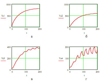 Графики переходных процессов (рис. 6.45) показывают, что при заданном режиме работы температура поверхности штампа изменяется в пределах от 198оС до 144оС. Время нагрева штампа до заданной температуры составляет ок. 200 c.