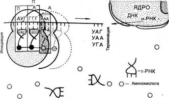 Дозревшая и-РНК переносит информацию о синтезе белка в рибосоме (рис.4). Информация закодирована в виде триплетов. Один триплет (кодон) кодирует место одной аминокислоты в белковой молекуле, а последовательность триплетов кодирует последовательность аминокислот в белковой молекуле. Перевод информации с и-РНК на последовательность аминокислот называется трансляцией (от лат. translatio — передача). В и-РНК существуют триплеты: инициирующий АУГ (определяет начало синтеза белка) и терминирующие УАГ, УАА, УГА (заканчивают синтез белка).