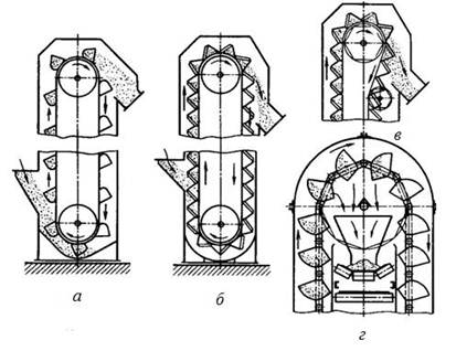 Рис. 5.4. Схемы загрузки и разгрузки ковшовых элеваторов: а – загрузка зачерпыванием, разгрузка под действием центробежной силы; б – загрузка засыпанием в ковши, разгрузка самотечная направленная; в – самотечная свободная разгрузка; г – центральная разгрузка