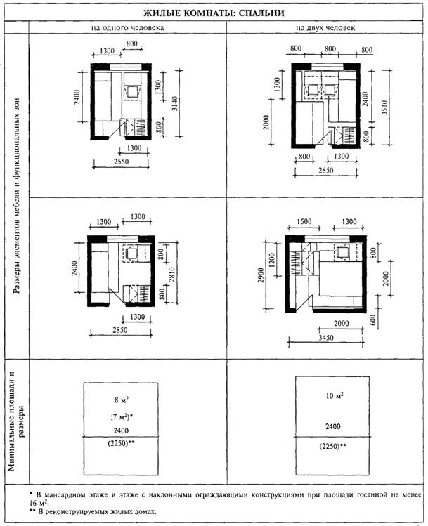 Площадь общей комнаты (гостиной) определяется с учетом возможности размещения вышеперечисленных зон, а также расстановки минимального набора мебели и устройства проходов. В однокомнатной квартире площадь общей комнаты должна быть не менее 14 м2; в квартирах с числом жилых комнат две и более - не менее 16 м2. Проектирование спален рекомендуется с учетом размещения следующих функциональных зон - сна, хранения одежды и белья, вещей бытового назначения; - индивидуальных, профессиональных и любительских занятий членов семьи.