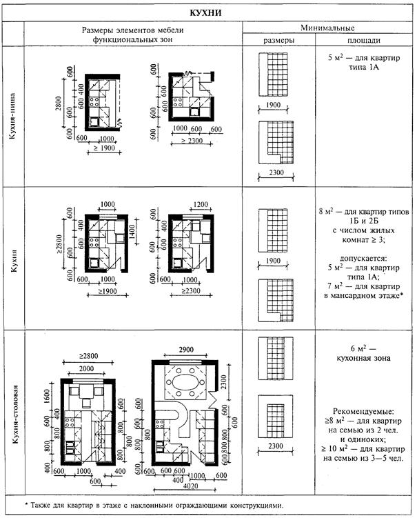- кухня - помещение с зоной, предназначенной для приготовления пищи, и обеденной зоной для эпизодического приема пищи членами семьи; - кухня-ниша - помещение (или его часть) без обеденной зоны, предназначенное для приготовления пищи, оборудованное электроплитой и обеспеченное приточно-вытяжной вентиляцией с механическим побуждением; - кухня-столовая - помещение с зоной приготовления пищи и с обеденной зоной для приема пищи всеми членами семьи одновременно. В зависимости от планировочной организации кухни, состава и габаритов оборудования рабочий фронт приготовления пищи может быть: - однорядным с размещением у одной из стен; - угловым с размещением у двух смежных стен; - двухрядным с размещением у двух противоположных стен; - П-образным. Площадь кухни с учетом возможности размещения вышеперечисленных зон, а также расстановки минимального набора мебели и устройства проходов должна быть: в однокомнатных квартирах - не менее 5 м2 (в том числе кухни-ниши); в квартирах с числом жилых комнат две и более - не менее 8 м2 (в мансардном этаже - 7 м2), площадь обеденной (кухонной) зоны в кухне-столовой - не менее 6 м2. При расстановке мебели в функциональных зонах помещений квартиры рекомендуется предусматривать: - ширину прохода вдоль кровати и другого спального места не менее 0,5 м с устройством проходов вдоль каждой из кроватей, поставленных смежно изголовьем к стене; - расстояние от наружной стены со световыми проемами до торца спального места не менее 0,5 м, до его продольной стороны - не менее 0,7 м (примыкание спального места к окну не рекомендуется); - расстояние от окна до предметов мебели, как правило, не менее 0,1 м, от дверного проема - 0,1 м, а при наличии около него выключателя (или розетки) - 0,25 м; - ширину прохода между стационарной мебелью соседних зон - не менее 0,5 м; - размещение рабочего стола не далее 1 м от окна с направлением дневного света прямо или слева; - размещение в зоне общесемейного отдыха телевизора на расстоянии от мест сидения, как правило, 2,5 - 3 м с предельным углом наблюдения не более 30°; - расстояние между сиденьями дивана, кресел и между журнальным столом не менее 0,3 м, сзади и по бокам кресел - не менее 0,2 м; - размеры стола в обеденной зоне из расчета не менее 0,6 м по фронту на одно посадочное место, расстояние между краем стола и стеной или другим оборудованием - не менее 0,6 м при одном стуле в ряду, 0,7 м - при двух стульях, 0,8 м - при трех и более стульях; - ширину прохода перед фронтом кухонного оборудования - не менее 1 м; - ширину прохода вдоль шкафов, тумб и другой мебели с распашными дверцами и выдвижными ящиками - не менее 0,7 м, перед шкафами с раздвижными дверцами - не менее 0,5 м. Ширину подсобных помещений следует предусматривать не менее: кухни при однорядном размещении оборудования - 1,9 м; при двухрядном (или угловом) - 2,3 м; внутриквартирных коридоров, ведущих в жилые комнаты, - 1 м; остальных коридоров - 0,85 м; передней - 1,4 м; ванной комнаты - 1,5 м; совмещенного санузла - 1,7 м; уборной - 0,8 м (глубина при открывании дверей наружу не менее 1,2 м, внутрь - 1,5 м). Кроме обязательного согласно СНиП 31-01 оснащения санитарно-гигиенических помещений квартир в ванной комнате или в совмещенном санитарном узле рекомендуется предусматривать место для размещения стиральной машины.