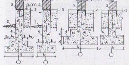 Рис. 2. Монолитные ленточные фундаменты I - отмостка: 2 - гидроизоляция; 3 - конструкция пола по грунту; 4 - монолитный бетон.