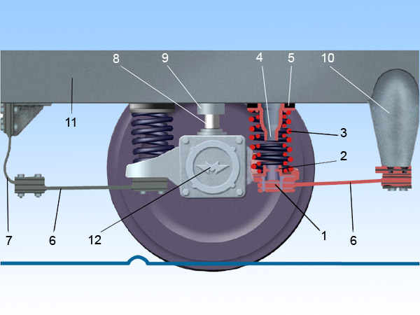 Тяговые и тормозные усилия от корпуса буксы на раму тележки передаются через плоские пружинные поводки. Каждую колесную пару соединяют с рамой тележки тремя поводками: двумя прямыми (6) и одним изогнутым (7). Прямые поводки - это полосы шириной 110 мм по концам и 70 мм в средней части и толщиной в середине 7 мм, а по концам 14 мм. Изогнутый поводок, имеющий прямое же сечение, является компенсирующим при опускании рамы тележки под нагрузкой. Такое соединение колесной пары с рамой тележки обеспечивает свободное перемещение рамы в вертикальной плоскости за счет упругой деформации поводков, ограниченное перемещение колесной пары (разбег) поперек пути пропорционально горизонтальной нагрузке и отсутствие перемещения вдоль пути. Поводки работают в крайне тяжелых условиях: так, при тяге или торможении одни поводки растягиваются, а другие работают на продольное сжатие с изгибом и, наоборот, при просадке рамы тележки они изгибаются в вертикальной плоскости. Возможны случаи, когда несколько нагрузок действуют одновременно. Наверху к корпусу буксы приварен штырь (8), который служит предохранителем на случай излома поводков и потери связи колесной пары с рамой тележки. Штырь входит внутрь втулки (9), вваренной в продольную балку рамы тележки. Между втулкой рамы и предохранительным штырем имеется радиальный зазор. При поломке пружин рама тележки торцами втулок обопрется на площадку штыря. Примечания: Соединение поводков друг с другом, с крыльями буксы и тумбой осуществляется при помощи нарезанных гребенок, а также четырех стягивающих болтов (на одно соединение); Компенсирующие прокладки необходимы для обеспечения оптимального зазора между буксой и рамой тележки в пределах 55 - 67 мм с целью снижения статических нагрузок на поводки, возникающие при перегрузке вагона в часы "пик" и чрезмерного опускания рамы тележки относительно колесных пар; Пружины надбуксового подвешивания (также как и центрального) выполнены двухрядными (одна в одной) и с разной навивкой. Внутренняя пружина - левой (9 витков), а внешняя - правой (5,6 витков). При этом разница по высоте двух пружин в свободном (ненагруженном) состоянии не должна превышать - 2 мм.