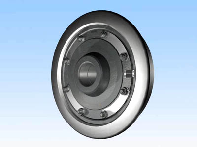 Рис. 6.19. Нажимная шайба Штифты служат для предотвращения проворота нажимного диска относительно колесного центра и среза болтов крепления. Болты контрятся общей пластинчатой шайбой. Для отвода тока от колеса в ходовой рельс, каждое колесо имеет два гибких медных шунта сечением 50 мм2, которые соединяют колесный центр с центральным диском. Особенностью конструкции подрезиненного колеса является то, что колесный центр не соприкасается с бандажом или центральным диском, а как бы «висит» на резиновых вкладышах, которые, благодаря сильному сжатию, работают на сдвиг. Происходит перемещение слоев резины друг относительно друга.