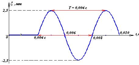 По существу, график За время, равное 0,01 волна ушла от конца струны на расстояние 0,25 м. Видим, что минимальное расстояние между точками, колеблющимися одинаково, т.е. длина волны, равна 7. Зависимость смещения точки струны, расположенной на расстоянии