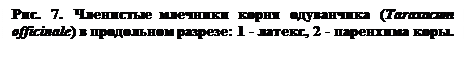 б) Членистые млечники (рис. 7) состоят из нескольких трубчатых клеток, соединенных в однорядные тяжи. Конечные стенки клеток частично или полностью разрушаются, как при образовании сосудов ксилемы или члеников ситовидных трубок. Поэтому млечники такого типа называют млечными трубками или сосудами.