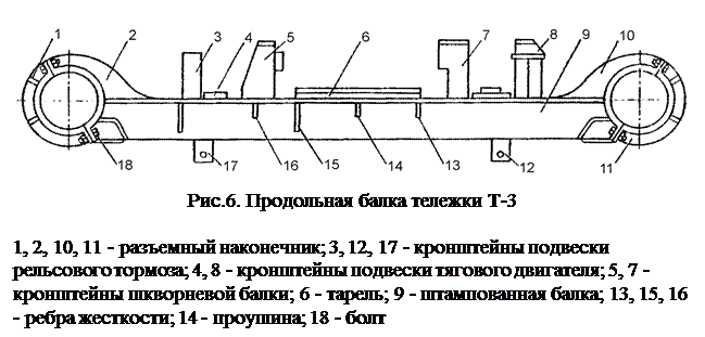 Вагон Т-3 имеет тележку мостового типа (рис.5). Продольные балки и мосты тележки образуют раму, на которую монтируют остальные части. Стальные литые кожуха редукторов имеют отверстия для фиксирующих штифтов и два посадочных места для установки продольных балок. В центральной части тележки (см. рис.5) расположена шкворневая балка с уширениями на концах для пружин и амортизаторов центрального рессорного подвешивания. Шкворневая балка расположена между резиновыми блоками, расположенными в кронштейнах продольных балок и передающими горизонтальные усилия от продольных балок на шкворневую. Между колесными парами и шкворневой балкой с помощью рези-нометаллических амортизаторов установлены две балки подвески тяговых двигателей, к которым стальными поясами крепят тяговые двигатели. К торцу каждой балки крепится электромагнитный привод барабанного тормоза. Вращающий момент от тягового двигателя к оси колесной пары передается карданным валом и редуктором моста. На передней тележке вагона к продольным балкам крепят направляющие устройства для рукавов песочниц. При раскантовке тележек направляющие рукава песочниц переставляются на противоположный конец продольной балки передней тележки. На кронштейнах балки крепят надколесные кожуха. Они предохраняют электрооборудование от воды и грязи, разбрызгиваемых колесами при движении. Между колесными парами вдоль продольных балок подвешены башмаки рельсового тормоза.