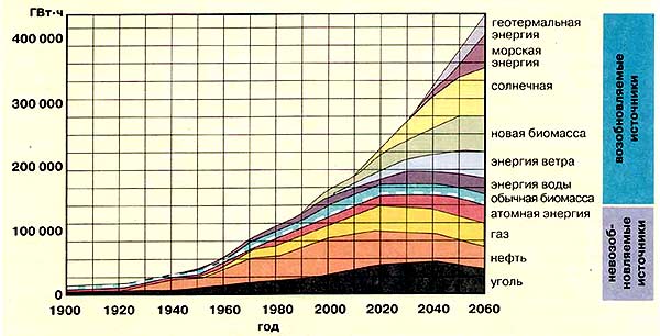 Горючие сланцы. Месторождения горючих сланцев разведаны на территории Перелюбского, Ивантеевского, Озинского, Краснопартизанского и Пугачевского районов. Общие запасы составляют 11 млрд. тонн (8-10 млрд. тонн - в Заволжье и более 1,0 млрд. тонн в Перелюбском районе). Однако сланцы Поволжья являются высокосернистым и низкокалорийным топливом (содержат 4-6% серы и 70-75% минеральных веществ, а теплота их сгорания не превышает 5-8 тыс. кДж/кг). Это препятствует их широкому применению в качестве топлива. До конца 19 века уголь и древесина были главными источниками энергии. К 1890 г. нефть составляла только 2% от всех энергоисточников. Использование ископаемого топлива (или невозобновляемых источников энергии, особенно нефти и газа) сильно возросло после второй мировой войны и продолжает увеличиваться. На рисунке показан прогноз производства энергии до 2060 года.