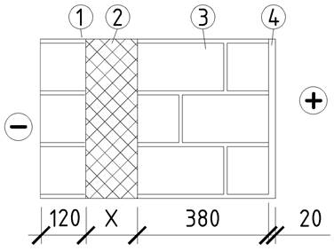 Теплотехнический расчет наружной стены. Определим толщину утеплителя наружной стены жилого дома, выполненного из керамического кирпича в условиях зимы г. Смоленск в нормальных условиях эксплуотации.(рисунок 5).