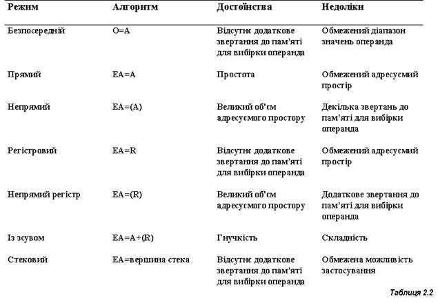 Практично у всіх існуючих моделях комп'ютерів передбачено декілька режимів адресації. Тому виникає питання, яким чином вузол керування процесора довідається, який саме режим адресації заданий у конкретній машинній команді. Існує кілька методів рішення цієї задачі. Часто за визначеним кодом операції "закріплюється" і визначений режим адресації. Альтернативний варіант передбачає, що у форматі команди виділяється декілька бітів під поле режиму адресації.Код у цьому полі і визначає режим адресації при виконанні конкретної команди. Друге зауваження стосується інтерпретації обчисленої виконавчої адреси (ЕА). У системах, що не працюють з віртуальною пам'яттю, виконавча адреса є або адресою в оперативній пам'яті, або ідентифікатором визначеного регістра процесора. У системах з віртуальною пам'яттю виконавчою адресою є або віртуальна адреса, або ідентифікатор регістра. Відображення сформованої виконавчої адреси на фізичний адресний простір — це функція механізму підтримки сторінкової організації, що працює без втручання програміста. Безпосередня адресація Найпростіший з погляду програміста режим — безпосередня адресація. У цьому режимі в код команди включається значення операнда: О=А. Цей режим часто застосовується для визначення і використання константи чи установки вихідного значення перемінної. Як правило, операнд є цілим числом у додатковому коді, і лівий розряд поля операнда в команді є знаковим. При завантаженні операнда в регістр знак розширюється вліво для заповнення вільних розрядів регістра за звичайним правилом. Достоїнством безпосереднього режиму є те, що для вибірки операнда після вибору команди з пам'яті не потрібно виконувати ніяких додаткових операцій з пам'яттю. У результаті заощаджується один такт звернення до пам'яті чи такт звернення до кешу в циклі виконання команди. Недолік цього режиму — малий діапазон значень операнда, пов'язаний з обмеженою довжиною адресного поля в команді, яке займає в цьому випадку код операнда. Як правило, у більшості сучасних комп'ютерів довжина адресного поля значно менше довжини слова. Пряма адресація Режим прямої адресації також є одним з найпростіших. Адресне поле при цьому містить виконавчу адресу операнда: ЕА=А. При виконанні команди з таким режимом адресації потрібно лише одне додаткове звернення до пам'яті для вибірки операнда і не потрібні ніякі спеціальні обчислення. Природне обмеження цього режиму — можливість працювати в невеликому (по сучасних мірках) адресному просторі. Непряма адресація Оскільки довжина адресного поля в коді команди в сучасних комп'ютерах звичайно значно менше довжини машинного слова, пряма адресація дозволяє задати адресу в обмеженому діапазоні. Одне з рішень, що допомагає справитися з цим обмеженням, — тримати в адресному полі не виконавчу адресу операнда, а посилання на нього, тобто адресу слова в пам'яті, у якому міститься виконавча адреса операнда. Такий метод називається непрямою адресацією: ЕА=(А). Ми уже відзначали, що дужки в цьому вираженні означають вміст. Істотне достоїнство зазначеного методу полягає в тому, що при довжині машинного слова N біт можна в цьому режимі адресувати 2N адрес у пам'яті. Але за це доводиться платити — при виконанні команди для вибірки операнда потрібно два додаткових звертання до пам'яті: одне — д
