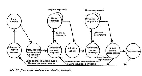 Операції, які виконуються у фазі витягу команди і непрямої адреси, прості і легко прогнозуються. Цього не можна сказати про операції фази виконання команди, оскільки вони залежать як від вмісту коду команди в регістрі IR, так і від результатів виконання попередньої команди (а іноді і декількох попередніх команд). У цій фазі може виконуватися передача даних між регістрами або читання запису у пам'ять або модуль вводу-виводу, і/або виконання арифметичних чи логічних операцій за участю АЛП. Остання фаза циклу — фаза переривання — також досить проста і передбачувана (мал. 5.11). Якщо мається запит переривання й обробка переривань дозволена, зберігається поточний вміст лічильника команд, що дозволяє надалі відновити виконання перерваної програми з тієї ж крапки. Для цього вміст PC передається в регістр MBR, щоб його можна було записати в пам'ять. Адреса осередку, яка виділена з цією метою в пам'яті, "знає" пристрій керування і передає його в регістр MAR. Найчастіше для збереження вмісту лічильника команд використовується системний стек і, таким чином, ця адреса міститься в регістрі покажчика стека. У PC замість поточної адреси перерваної програми завантажується початкова адреса підпрограми обробки переривання. У результаті наступний цикл почнеться з витягу першої команди підпрограми