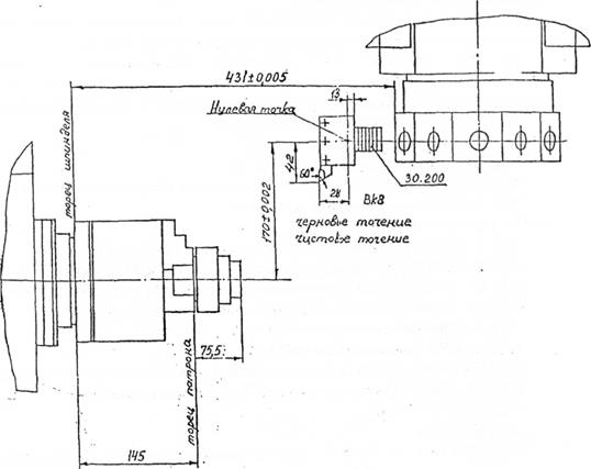 Рис. 7. Ступенчатый валик и наладка для его обработки Неуказанные предельные отклонения по ГОСТ 1.76253-78 Пример 1„ Составить программу для обработки ступенчатого валика, изображенного на рис. 7. Режимы обработки с учетом мощности развиваемого приводом шпинделя токарного, привода продольной и поперечной подач, надежности закрепления заготовки в патроне, получения необходимой точности и шероховатости представлены в таблице 15
