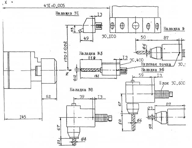 Для обточки валика используется проходной резец, закрепляемый в резцедержателе 2210.0356.000. (рис. 8). Такая установка резца позволяет обойти заданный наружный контур данной детали при малом вылете резца и без столкновения резцом или резцедержателем с заготовкой или элементом станка. Рассмотренному резцовому блоку задается код 11, который заносится в корректор 391.Исходному положению револьверной головки присваивается код 1, который заносится в корректор 381. Наладка на обработку ступенчатого валика представлена на рис. 8, где показано базирование заготовки в патроне. На основании намеченных переходов с учетом режущей части инструмента рассчитаны абсолютные и относительные размеры.