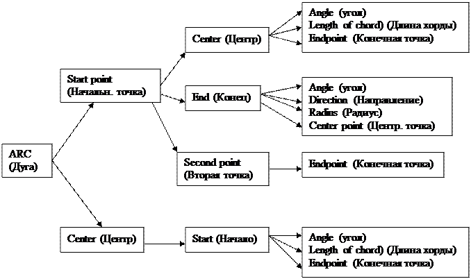 Схема на рис.3дает представление о взаимной связи между опциями вычерчивания дуги в AutoCAD. Когда команда Arc запускается, вы можете выбрать одну из двух опций – Start point (Начальная точка) и Center (Центр). Далее, в зависимости от выбранной опции, перед вами открывается возможность выбора следующих опций.