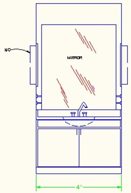 Рис. 3 3. Укажите одну из линий штриховки на зеркале. Обратите внимание, что она вычерчена красным цветом, а цвет слоя, как можно убедиться в раскрывающемся списке Line-type Control, — Magenta (фиолетовый). Выделите все линии штриховки. Щелкните мышью на раскрывающемся списке Color Control (Управление цветом) и выберите первый пункт списка ByLayer. Дважды нажмите клавишу <Esc>, чтобы удалить ручки и увидеть результат. 4. Выберите зеленую размерную надпись под умывальником. (Размерная надпись - это один объект.) Чтобы лучше выделить его на чертеже, щелкните мышью на раскрывающемся списке Color Control (Управление цветом) и выберите Red (красный). Дважды нажмите клавишу <Esc>, чтобы увидеть результат. 5. Укажите отрезки 1 и 2, руководствуясь рис. 3. Щелкните мышью на раскрывающемся списке Linetype Control (Управление типом линии) и выберите тип линии Hidden (Невидимая). Дважды нажмите <Esc> - выделение будет снято с линий этого типа. 6.Выделите дугу, которая отрисована штриховой линией на чертеже - это контур раковины. Раскройте список Lineweight Control и выберите в нем 0.30 mm. Дважды нажмите <Esc>. Щелкните на кнопке LWT в строке состояния. Теперь будет установлен режим отображения на экране линий регулируемой толщины, и вы сможете увидеть результат настройки нового значения этого параметра. 7. Щелкните мышью на раскрывающемся списке Color Control (Управление цветом) и выберите для текущего цвета Cyan (голубой). 8.Запустите команду RECTANGLE (ПРЯМОУГОЛЬНИК). Начертите прямоугольник слева в нижней части умывальника. Воспользуйтесь командой COPY (КОПИРУЙ), чтобы скопировать этот прямоугольник на правую сторону умывальника. (Для копирования используйте объектную привязку к точке пересечения 3 как к базовой точке и привязку к точке пересечения 4 как к целевой точке перемещения.) Прямоугольники будут вычерчены голубым цветом, несмотря на их принадлежность к слою A-detl-lw10. 9. Сохраните чертеж.