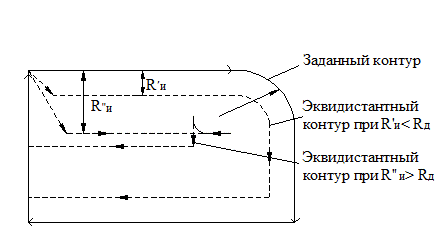 Рис. 26. При использовании в кадре функций G43 (G44) совместно с функциями G41 (G42), функции G43 (G44) выполняются до расчета эквидистантного контура. RД -–Радиус окружности R’И, R’’И -–радиус инструмента
