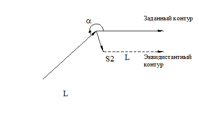 S5 - точка, находящаяся на расстоянии, равном величине радиуса инструмента, от точки S3 в направлении, перпендикулярном вектору смещения в начальной точке следующего кадра (рис. 33, 34). 9.11. После выхода на эквидистантный контур программирование осуществляется по контуру детали. Траектория центра инструмента при движении по эквидистантному контру проходит через те же точки, что и в случае выхода на эквидистантный контур. В случае перемещения центра инструмента по внутреннему контуру траектория центра инструмента проходит через точку S2 - точку пересечения прямых, перпендикулярных векторам смещения в конечной точке текущего и начальной точке следующего кадров, и проходящих через концы этих векторов. Варианты движения по эквидистантному контуру при a³180° показаны на рис. 33, 34. Прямая линия - прямая линия