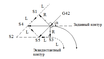 Примечание. В случае, если a»1800 и разность между векторами смещения конечной точки текущего кадра и начальной точки следующего кадра не превышает 0,005 мм, инструмент в текущем кадре сразу перемещается в точку S3 (рис. 9.9, 9.10). В случае перемещения по внешнему контуру под острым углом (a<90°) траектория центра инструмента аналогична траектории движения центра инструмента под тупым углом, если расстояние между точками S1 и S2 не превышает величину радиуса инструмента более чем на 1 мм. В противном случае траектория центра инструмента проходит через точки S1, S4, S5, S3, где S4 - точка, находящаяся на расстоянии, равном величине радиуса инструмента, от точки S1 в направлении, перпендикулярном вектору смещения в конечной точке текущего кадра; Прямая линия – прямая линия