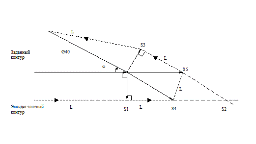 Функция G40 отменяет функцию G41 (G42). Для отмены вектора смещения (возврата из эквидистантного контура) необходимо задавать, кроме функции G40, хотя бы одну координату из плоскости эквидистанты в кадре с линейной интерполяцией. Тогда инструмент перемещается из текущей точки на эквидистантном контуре к точке, заданной в данном кадре. Если кадр с круговой интерполяцией, то полнится ошибка 35. Имеется несколько вариантов схода с эквидистантного контура. В случае перемещения по внутреннему контуру (α >= 180°) траектория проходит через точку S1,где S1 – конец вектора смещений в конечной точке текущего кадра (рис. 39, 40). Прямая линия - прямая линия