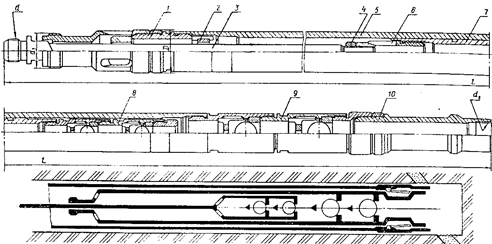 Рисунок 19 — Скважинный штанговый насос исполнения НВ2Б 1 — защитный клапан; 2 — упор; 3 — шток; 4 — контргайка; 5 — цилиндр; 6 — клетка плунжера; 7 — плунжер; 8 — нагнетательный клапан; 9 — всасывающий клапан; 10 — упорный ниппель с конусом.