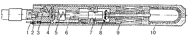 Рисунок 31 — Погружной диафрагменный электронасос 1 — токоввод; 2 — нагнетательный клапан; 3 — всасывающий клапан; 4 — диафрагма; 5 — пружина; 6 — плунжерный насос; 7 — эксцентриковый привод; 8 — конический редуктор; 9 — электродвигатель; 10 — компенсатор.