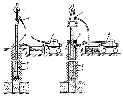 Рисунок 73 — Схема прямой (а) и обратной (б) промывок скважин 1 — колонна; 2 — НКТ; 3 — устьевой тройник; 4 — промывочный вертлюг; 5 — промывочный насосный агрегат; 6 — устьевой сальник; 7 — переводник со шлангом.