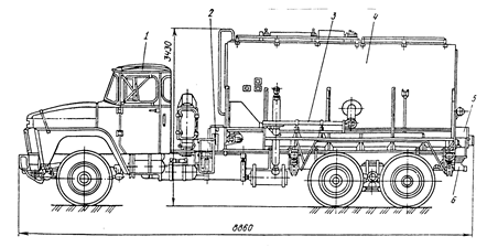 Рисунок 75 — Смесительная установка УС6-30 1 — шасси автомобиля КрАЗ-250; 2 — коробка отбора мощности; 3 — загрузочный и дозировочный винтовые конвейеры; 4 — бункер; 5 — система управления; 6 — смесительная устройство.