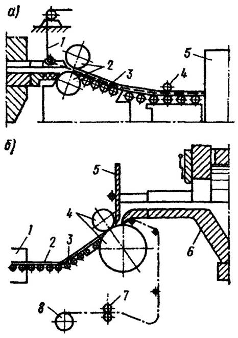 Рисунок 59 а – подача сетки сверху: 1 – металлическая сетка; 2 – прокатные валки; 3 – лента стекла; 4 – укатывающий валик; 6 – отжигательная печь. б – подача сетки снизу: 1 – отжигательная печь; 2 – лента стекла; 3 – валки роликового конвейера; 4 – прокатные валки; 5 – шамотный шибер; 6 – сливной порог с линейкой; 7 – вальцы для выравнивания сетки; 8 – рулон сетки