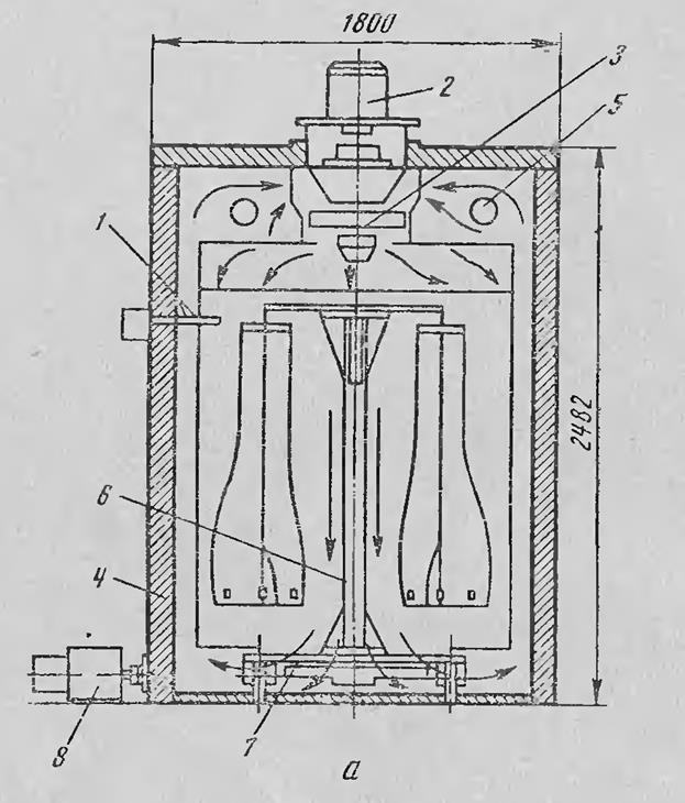 Рисунок 18 – Термокамера для обработки брюк «Икоде», Япония Датчик 1 терморегулятора расположен на уровне верхнего участка брюк. Электродвигатель 2 вентилятора размещен на верхней стенке камеры. Несколько ниже закреплен вентилятор 3. Корпус камеры 4 имеет хорошую теплоизоляцию. Электронагревательные элементы 5 размещаются в верхней части камеры. Вешалка 6 закреплена на тележке 7 и получает вращение от электродвигателя 8 с редуктором. Производительность роторной термокамеры – 120 брюк в час. Вентилятор 3 обеспечивает равномерную температуру в термокамере. Работа всех агрегатов термокамеры и обеспечение режимов обработки автоматизированы. Реле времени дает команду для разгрузки камеры.