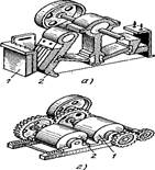 По конструкции и принципу действия дробилки разделяются на: 1) щековые с простым (рисунок, а) и сложным (рисунок, б) качанием подвижной щеки; в этих дробилках материал раздавливается и раскалывается между неподвижной 1 и подвижной 2 щеками в результате периодического их сближения; в дробилках со сложным качанием щеки материал еще и истирается. Щековые дробилки со сложным качанием подвижной щеки в основном применяются для мелкого дробления. Их преимущество перед дробилками с простым качанием подвижной щеки заключается в простоте конструкции при относительно низком удельном расходе энергии. 2) конусные (рисунок б), в которых материал раздавливается и частично изгибается между двумя конусами; внешний конус 1 неподвижен, а внутренний (дробящий) 2, посаженный на вертикальный вал 3, движется по окружности по отношению к внешнему конусу, 3) валковые (рисунок г), в которых материал раздавливанием истирается между двумя валками 1 и 2, вращающимися один навстречу другому; 4) молотковые (рисунок, д.), в которых материал дробится при ударе его молотками, свободно подвешенными на быстровращающемся роторе 2, и частично истирается. Измельчают мел, волокнистые вещества, отходы линолеума. 5) бегуны (рисунок, ё) - предназначаются для мелкого дробления и грубого помола; материал раздавливается и истирается между двумя вращающимися катками 1 и чашей 2.