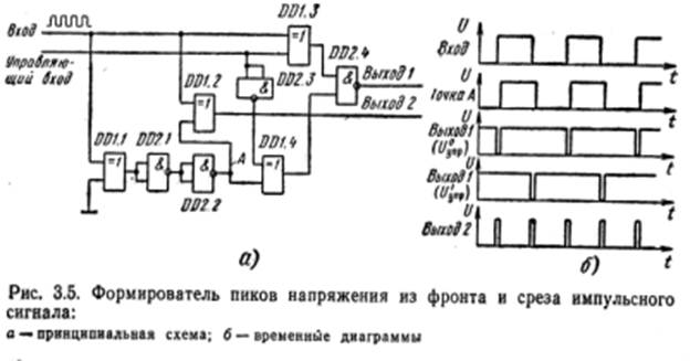 Термин «формирователи импульсов» объединяет широкий круг различных устройств, предназначенных для преобразования сигналов — цифровых и аналоговых—таким образом, чтобы получить импульсы с требуемыми временными и амплитудными характеристиками. Как правило, в ходе формировании импульсов стремятся обеспечить в первую очередь какой-то один главный для каждого конкретного случая параметр. Формирование протекает во время действия входного сигнала. По этому признаку формирователи отличают от регенеративных устройств, например одновибраторов, которые входной сигнал только запускают, после чего процесс образования выходного импульса идет самостоятельно за счет положительной обратной связи В функциональном отношении формирователи отличаются большим разнообразием. Типичными случаями формирования являются: - нормализация фронта и среза импульсов (повышение их крутизны); - формирование импульсов по фронту и срезу, т. е. генерация кратковременных (τи< 1 мкс) импульсов, момент появления которых совпадает с фронтом или срезом входного импульса; - временное преобразование импульсов (укорочение, временная задержка и т. п.); - удвоение частоты следования импульсов; - преобразование формы импульсов и получение прямоугольных импульсов из сигналов другой формы, в частности из аналоговых, главным образом — синусоидальных.