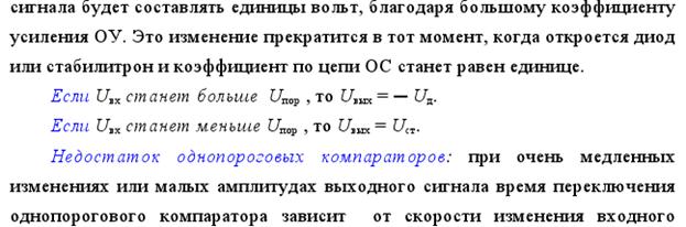 Если входной сигнал будет изменяться очень медленно, то при достижении уровня входного сигнала опорному, выход компаратора может многократно с большой частотой менять свое состояние под действием незначительных помех (так называемый "дребезг").
