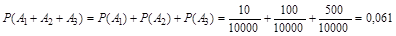Теорема 1 (о сумме попарно несовместных событий). Вероятность суммы попарно несовместных событий равна сумме вероятностей этих событий, т.е. Пример: В лотерее выпущено 10 000 билетов и установлено 10 выигрышей по 200 рублей, 100 выигрышей по 100 рублей, 500 выигрышей по 25 рублей и 1 000 выигрышей по 5 рублей. Какова вероятность того, что человек, купивший билет выиграет не менее 25 рублей? Решение: А – человек выиграл не менее 25 рублей;