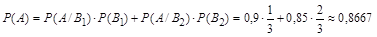 Во многих прикладных задачах рассматриваются процессы, которые могут пойти по одному из нескольких возможных вариантов развития, т.е. процесс может «разветвляться» случайным образом. Например, на заводе на нескольких станках обрабатываются однотипные детали, которые случайным образом попадают на станок и после обработки поступают в общий контейнер. В таких ситуациях возникают две различные постановки задачи: · Найти вероятность изготовления бракованной детали, не зная на каком станке она обработана; · Обнаружив бракованную деталь, попытаться оценить на каком станке она обрабатывалась. Решение этих двух типов задач возможно с помощью формулы полной вероятности и формулы Байеса. Пусть события События Пример: Два станка производят детали, поступающие в общий контейнер. Вероятность получения стандартной детали на первом станке равна 0,9, а на втором 0,85. Второй станок имеет производительность в два раза больше, чем первый. Какова вероятность того, что выбранная случайным образом деталь с конвейера стандартная? Решение: Введем события: А – наудачу взятая деталь с конвейера – стандартная; В1 – взятая деталь изготовлена на 1 станке; В2 – взятая деталь изготовлена на втором станке.