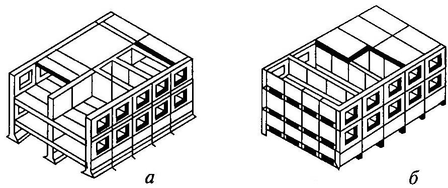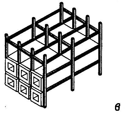 Рис.1. Конструктивные схемы зданий: а) бескаркасная с продольными несущими стенами; б) бескаркасная с продольными и поперечными несущими стенами; в) каркасная; г) с неполным каркасом