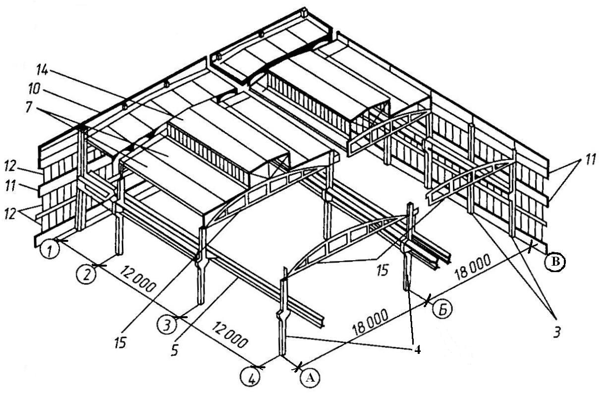 Рис.4. Конструктивные элементы каркасных одноэтажных промышленных зданий: а) с плоским покрытием; б) со скатным покрытием и фонарями; 1 – фундаменты и блоки; 2 – фундаменты; 3 – колонны крайнего ряда; 4 – колонны среднего ряда; 5 – подкрановые балки; 6 – балки покрытия; 7 – плиты покрытия; 8 – воронка водостока; 9 – утеплитель и кровля; 10 – парапет; 11 – панели стены; 12 – оконные переплёты; 13 – пол; 14 – фонарь; 15 – стропильные фермы (скатной) и бесчердачной. Оконными и дверными блоками заполняют- ся специальные соответствующие проёмы в стенах и перегородках. В одноэтажных каркасных производственных зданиях все конструкции внутри здания опираются на элементы каркаса или на самостоятельные фундаменты. Каркасные здания могут быть однопролётными или многопролётными с пролётами одинаковой или разной ширины. Покрытия таких зданий выполняются плоскими или скатными пологими, с фонарными надстройками или без них (рис. 4). Основные конструктивные элементы производственных зданий (также см. рис.6): колонны, балки покрытия или стропильные фермы (плоские поперечные рамы). На них опираются продольные элементы каркаса: подкрановые балки для мостовых кранов, ригели фахверка (дополнительного стенового каркаса, обеспечивающего устойчивость основного каркаса), плиты покрытия или прогоны кровли, фонари (устройства для обеспечения естественного освещения зданий и их проветривания). Фонари располагают вдоль пролётов здания. Стены каркасных зданий часто делают навесными. Они состоят из плит или панелей, которые крепятся к колоннам («навешиваются» на них). Многоэтажные промышленные здания строятся с полным каркасом. Междуэтажные перекрытия укладываются на ригели (горизонтальные балки), которые опираются на колонны. Конструктивная схема таких зданий аналогична схеме каркасных гражданских зданий (см. рис.5).