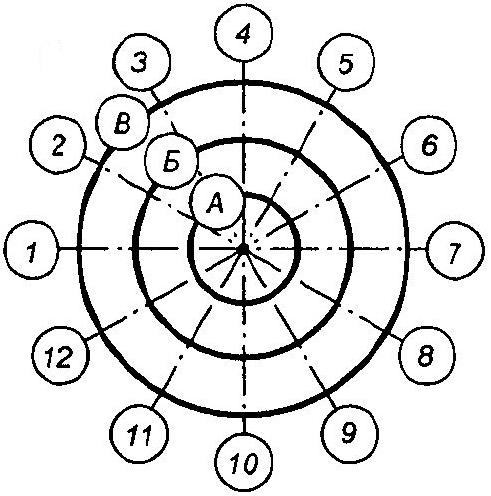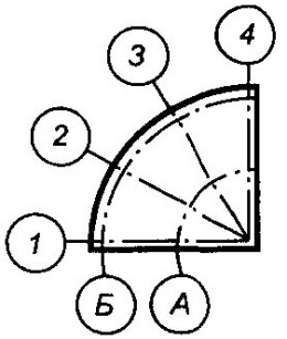 маркируются буквами от центра к периферии и цифрами – от левой горизонтальной оси по часовой стрелке (рис. 7,а; 7,в). Обозначения осей принято наносить по нижней и по левой сторонам плана здания. Если оси противоположных сторон здания не совпадают, то их маркируют по каждой стороне соответственно (рис. 7,г). Для каких-либо элементов, расположенных между координационными осями основных несущих конструкций (например, колонн при схеме здания с неполным каркасом), наносят дополнительные оси. Эти оси обозначаются дробью: в числителе указывается обозначение предшествующей координационной оси, а в знаменателе – дополнительный порядковый номер в пределах участка между смежными координационными осями (рис. 7,д). Допускается осям фахверковых колонн не присваивать дополнительные номера, а обозначать их в продолжение обозначения осей основных колонн.