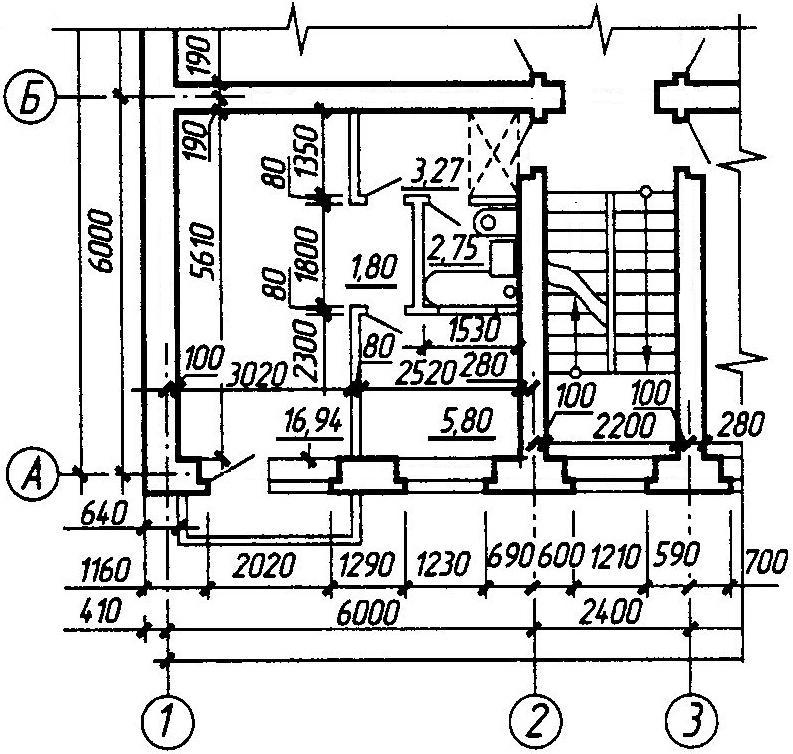 разрезов – не менее 60 мм до внутренней рамки чертежа с каждой указанной стороны (рис. 20, а). 2. Вычерчивают контуры капитальных стен (колонн) с учётом их привязки (рис. 20, б). 3. Вычерчивают контуры перегородок внутри помещения (рис. 20, б). 4. Вычерчивают оконные и дверные (воротные) проёмы и по- лотна в наружных стенах (рис. 20, в). 5. Вычерчивают дверные проёмы и полотна во внутренних сте- нах и перегородках (рис. 20, в). 6. Вычерчивают контуры санитарно-технических устройств (рис. 20, в). 7. Намечают разбивку элементов лестничной клетки (лестнич- ных площадок и лестничных маршей); окончательное изображение лестничных маршей осуществляют после выполнения разреза, на котором будет проведена графическая разбивка лестницы (рис. 20, в). 8. На плане проставляют все требуемые размеры, обозначения, площади помещений и т.п (рис. 20, г). Нанесение размеров – важная часть выполнения чертежа. Все размеры проставляют в виде замкнутых цепочек. Снаружи плана вдоль левой и нижней его сторон (а при необходимости – со всех четырёх сторон) выполняется по три размерных цепочки. Расстояние от стены до первой размерной цепочки принимается в пределах 14…21 мм – для удобства нанесения размеров и чтения чертежа. Расстояние между остальными размерными цепочками – 7…10 мм. На первой от стены цепочке указывают размеры оконных и дверных (воротных) проёмов и простенков между ними. На ней же либо в промежутке между этой цепочкой и стеной можно указать привязку наружных стен к координационным осям. На второй размерной цепочке указывают расстояния между соседними координационными осями. На третьей размерной цепочке указывают расстояние между крайними координационными осями. Перед нанесением размеров маркируют координационные оси здания. Кружк Внутри плана здания тоже прокладывают размерные цепочки между внутренними гранями наружных стен. На них указывают размеры, определяющие толщину внутренних стен и их привязку, толщину перегородок, размеры помещений, привязку дверных проёмов к ближайшим стенам и перегородкам. Наносят условные обозначения дверных проёмов (Д1, Д2 и т.д.) аналогично оконным. Как можно ближе к нижнему правому углу каждого помещения проставляют и подчёркивают основной линией площадь этого помещения в квадратных метрах. Площадь высчитывается с точностью до двух десятичных знаков. На планах производственных зданий (см. рис.19) упрощённо, но, по возможности, похоже на натуру, изображают размещение технологического оборудования (насосы, станки и т.п.). Контуры оборудования проводят более толстыми линиями, чем план здания. Каждому виду оборудования присваивают определённый номер (позицию) и указывают эту позицию в экспликации. В бытовых помещениях также выполняют размещение соответствующего оборудования (см. рис.18). Над планом каждого этажа выполняют соответствующую надпись по типу: ПЛАН 1 ЭТАЖА шрифтом размера № 10 или № 15 – в зависимости от величины свободного места на поле чертежа, на котором может быть размещена надпись.
