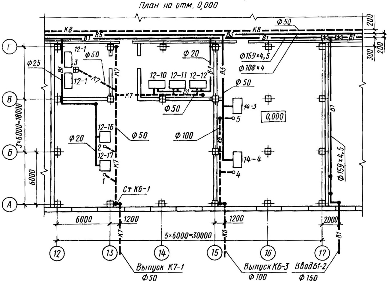 Рис. 34. План системы водоснабжения и канализации промышленного здания