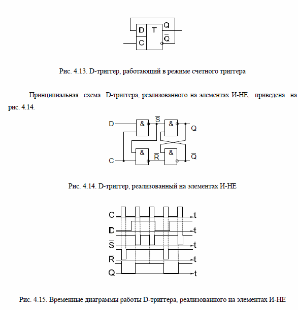 JK-триггер D-триггер D-триггер – устройство, которое запоминает информацию, которая присутствует на вхо- де D в момент прихода синхроимпульса на вход C. Условное обозначение D-триггера приведено на рис. 4.11, временные диаграммы работы – на рис. 4.12. Схема включения D-триггера для работы в режиме счетного триггера приведена на рис. 4.13.