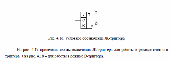 JK-триггер имеет два информационных входа J и K и вход синхронизации C (рис. 4.16). При условии J = K = 1 этот триггер работает как счетный триггер (переключается каждый раз в противоположное состояние, когда синхроимпульс поступает на вход C), а в остальных случаях работает как синхронный RS-триггер, причем вход J соответствует входу S, а вход K – входу R (табл. 4.3).