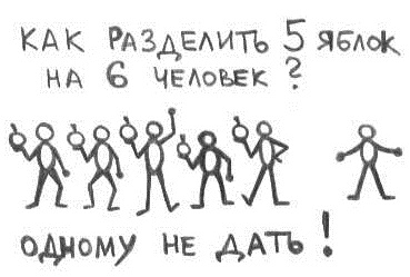 Необходимо осознать, что при объяснении ребенку математики (да, впрочем, и всех других предметов) существует не один путь, а множество. Какой из них выбирать в каждом конкретном случае, мы решаем сами. Я осуществляю выбор чисто спонтанно, интуитивно, по вдохновению. Но есть и некие общие ориентиры, о которых я стараюсь помнить. Для начала, наверное, стоит сказать о программе. Давным-давно завуч младших классов нашей школы подарила мне книжечку, где подробно расписаны программы по основным предметам 1-3 классов. Там четко указаны и объемы знаний, и необходимые навыки для каждого года обучения. Очень удобно. Я периодически сверялся с этой книжечкой и мог ориентироваться в обучении своих детей. Особенно по математике там все ясно изложено. Работали мы по взятому в школе учебнику. Но довольно часто я объяснял как-то иначе, сам придумывал задачи и примеры. В конце учебника обычно есть задания на повторение – их мы обычно выполняли все (чтобы проверить, все ли усвоено хорошо). Я следил за тем, чтобы мои дети глубоко поняли основы математики, а не только освоили чисто технически какие-то темы. Ведь тут все совсем не так просто, как может показаться. Та математика, которой мы сейчас пользуемся, создавалась сотни и даже тысячи лет умнейшими людьми. Ребенку требуется время и условия для привыкания к математической логике, к математическим понятиям, ко всей сфере математических методов. Не надо спешить. Сам по себе объем изучаемой в начальной школе информации по математике микроскопически мал. Основные усилия идут на прочувствование, на привыкание, на адаптацию к новому для ребенка способу мышления. Маленький Коля никак не мог понять, почему разделить – это обязательно разделить поровну. А действительно, почему? Ведь в жизни далеко не всегда так бывает. Или вот такая парадоксальная задачка. Как разделить пять яблок на шесть человек так, чтобы каждому досталось целое яблоко? Коля предложил простое решение: «Одному не дать!»