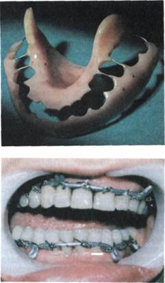 Рис. 10.21. Виды назубных и зубона-десневых шин, применяемых для лечения переломов нижней челюсти у детей в период молочного и сменного прикуса.