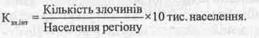Його можна обчислювати і відносно якоїсь частини населення. Найбільш розумно обчислювати його відносно населення віком 14 років і старше, хоча існують й інші точки зору Деякі вчені вважають, що слід брати до уваги лише населення старше 16 років — віку кримінальної відповідальності в повному обсязі. На думку інших, треба враховувати все населення даної території. Цей показник в останні роки використовується лише при проведенні аналітичних розрахунків, оскільки показник розкриття злочинів не дуже високий. При цьому вважаємо, що одержуємо фактичні дані не про всіх осіб, які вчинили злочини, а лише про тих, які були встановлені в процесі розслідування. Тому для характеристики і порівняння окремих територій частіше застосовуються інші показники. Коефіцієнт злочинної інтенсивності характеризує, як часто вчиняються злочини на тій чи іншій території. Він обчислюється як відношення кількості зареєстрованих злочинів до всього населення і помножується на 10 тис. населення (фактичні дані по регіонах України наведено в табл. 5, на рисунках 7 та 14 ці дані подано у вигляді графіку). Цей показник можна обчислити за формулою