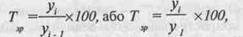 де Т — темп зростання; у, — рівень ряду динаміки; у,_ ^ — попередній'йому рівень ряду динаміки; у, — початковий рівень ряду динаміки. У стовпчику 5 табл. 19 наведено темпи зростання, обчислені базисним способом (відносно 1990 р.), а в стовпчику 6 — ланцюговим способом. Якщо величина темпу зростання більше одиниці або ста відсотків, то це свідчить про те, що поточний рівень ряду динаміки більше рівня, з яким проводиться порівняння. Якщо величина темпу зростання дорівнює одиниці або ста відсоткам, то це характеризує, що не відбувалось ніякої зміни в рівнях ряду. Якщо величина темпу зростання менше за одиницю або сто відсотків, то це свідчить про те, що відбулося зменшення рівня ряду. В цьому випадку говорять не про темп зростання, а про темп зниження або падіння. Цей показник не може мати знак мінус, що б він не характеризував.